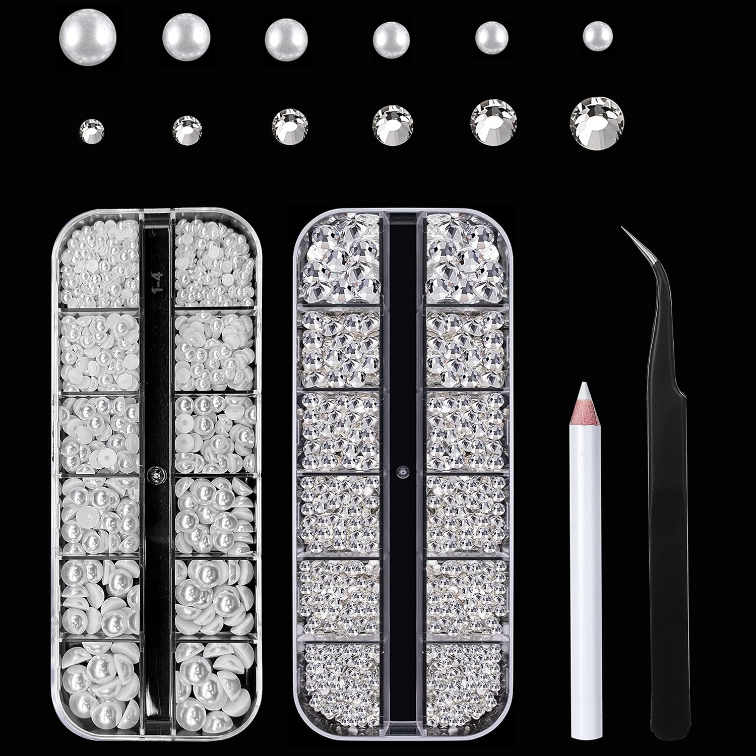 - 【Pearls and Rhinestones Kit for Nail Art】1 box clear nail rhinestones 2400pcs,1 box white half round nail pearls 1500pcs,1 wax pencil for rhinestones,1 nail tweezers.