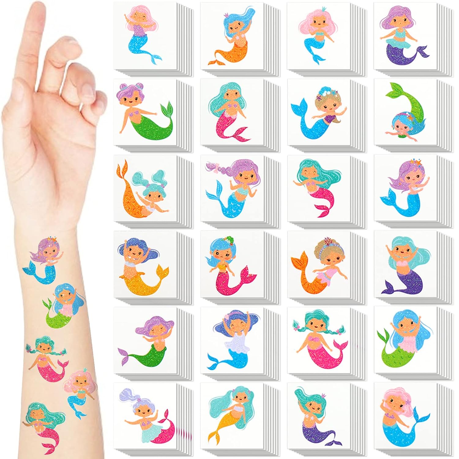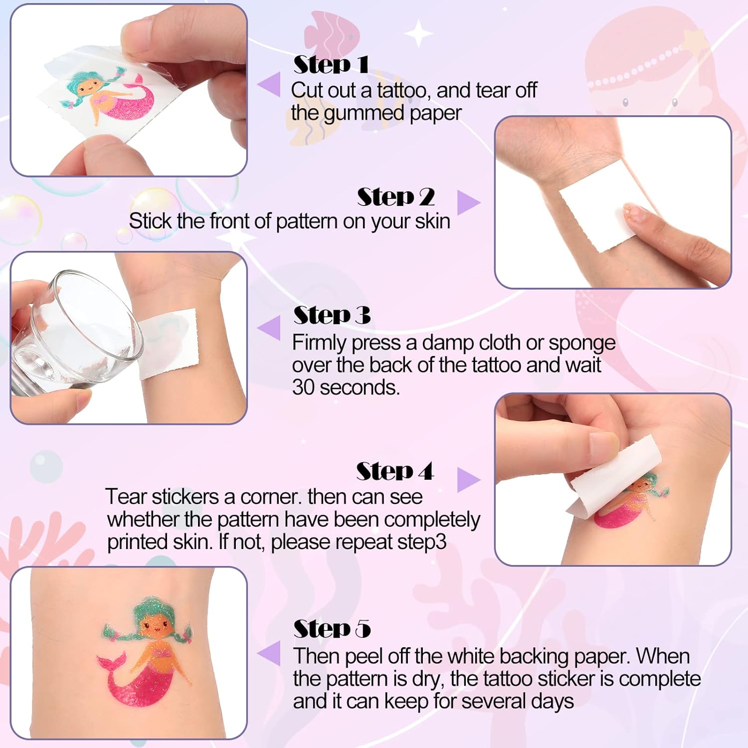 - Safe to Use: these mermaid party supplies have quality materials, with glittering surface, beautiful and unique, not easy to break or fade; Warm reminder: you need to cut out the pattern of mermaid tattoo first, tear off the surface film, then wet it with clean water, wait it for about 35-50 seconds, and finally tear it off gently