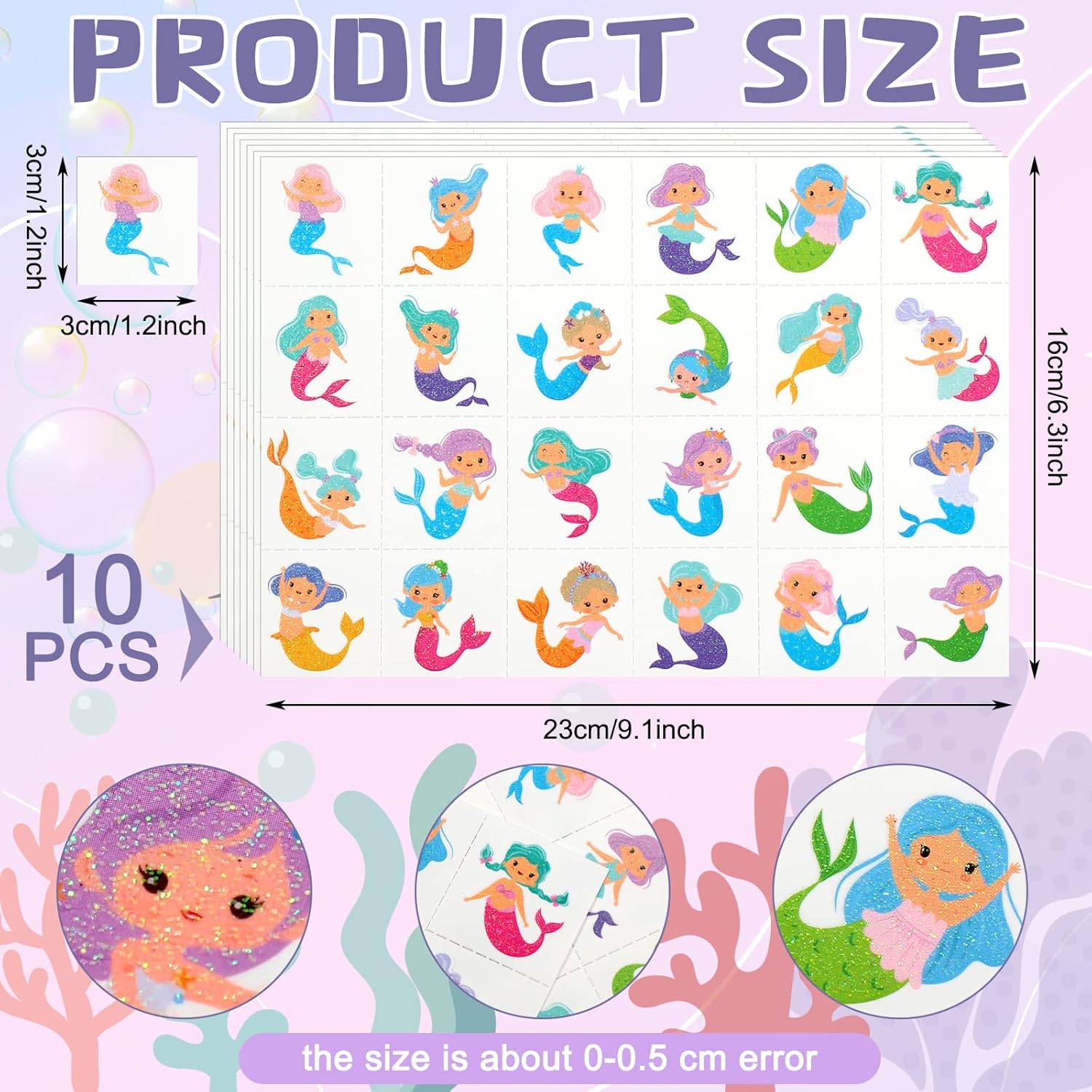 - Sufficient Mermaid Glitter Tattoos: the package comes with 10 sheets of mermaid tattoos for kids, each sheet has 24 pieces, a total of 240 pieces, including 24 styles; The abundant quantity and various patterns offer you many choices to choose the one you like for tattoos making, enough to satisfy your daily using and sharing on ocean themed party, make a nice beach party