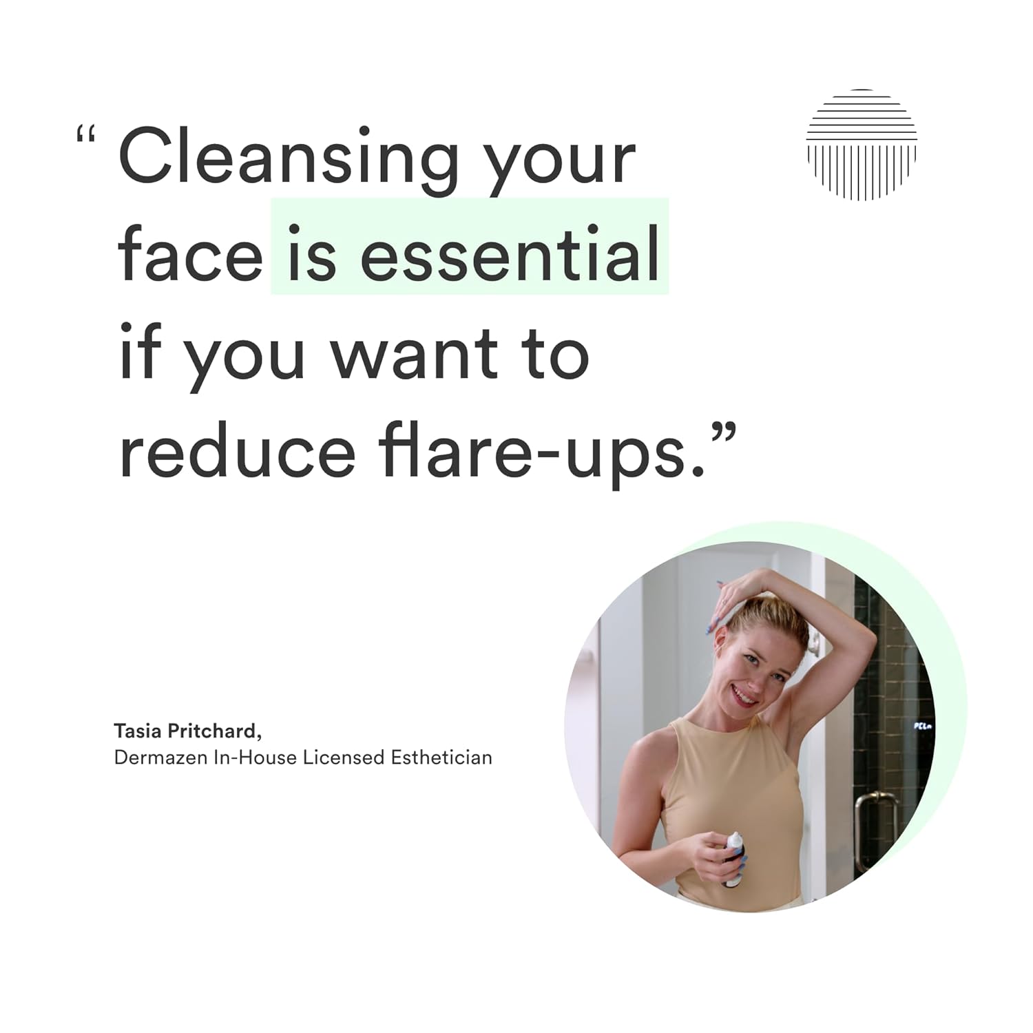- More than just a soap, Dermazen facial cleanser is three products in one. Learn how it works in 3 steps: 1. Disrupt the Biofilm - certain irritants create a biofilm shield that protects it from targeted treatment. 2. Clear the Bad Bugs - Once the biofilm is removed, you can clear away the dirt, oil and other skin irritants easier than ever. 3. Soothe the Skin - Now it’s time to nourish and hydrate your skin WITHOUT using lipids (like coconut oil) that feed the irritated skin and promote acne.