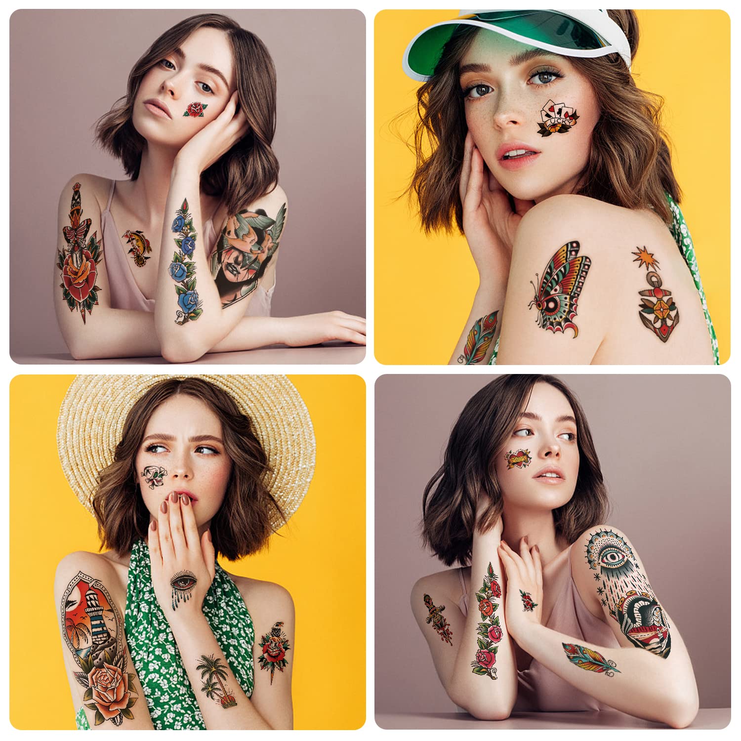 Yazhiji 77sheets Waterproof Temporary Tattoos,Old School Tattoo,Sailor Jerry Style Vintage Classical Fake Tattoo, American Traditional Flower Rose Arm Stickers for Women Men Adults Kids