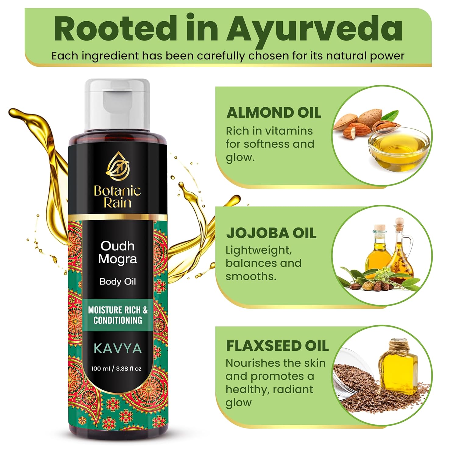 Ayurveda Body Oil with Oudh & Mogra – Organic, Nourishing & Hydrating for Dry, Flaky Skin – Fast Absorbing, Non-Greasy, Ayurvedic for Men & Women – 3.38 fl oz (Pack of 1)