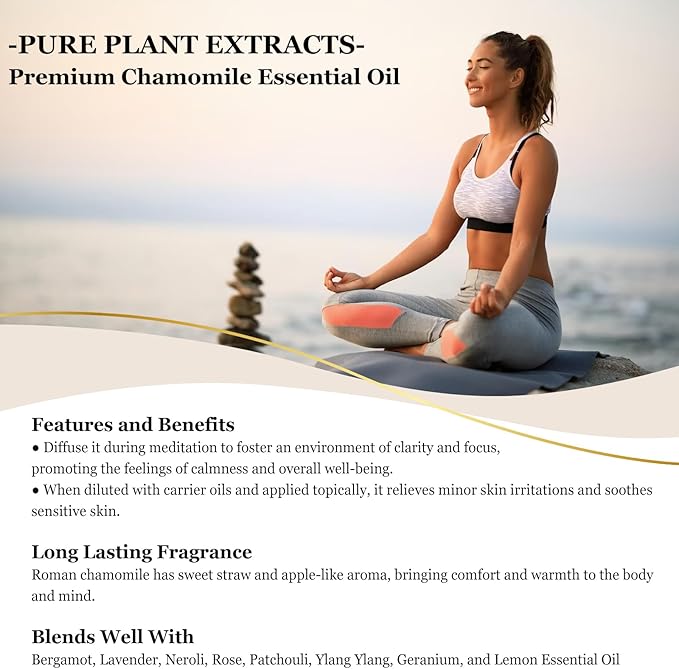 - QUANLITY ASSURANCE - Chamomile essential oil is distilled from the flowers and has a fruity herbal scent with a slightly sweet taste. Extracted from plants, does not add any additives, fillers.