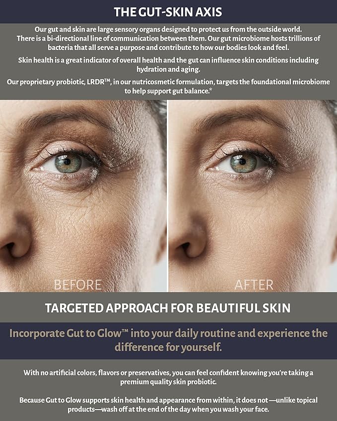 - Achieve Vibrant, Glowing Skin: Developed by a doctor and rooted in the science of gut-skin axis, Gut to Glow is the perfect solution to help you feel & look more vibrant. This probiotic skin supplement helps support gut balance, improve skin appearance and recapture radiance.*
