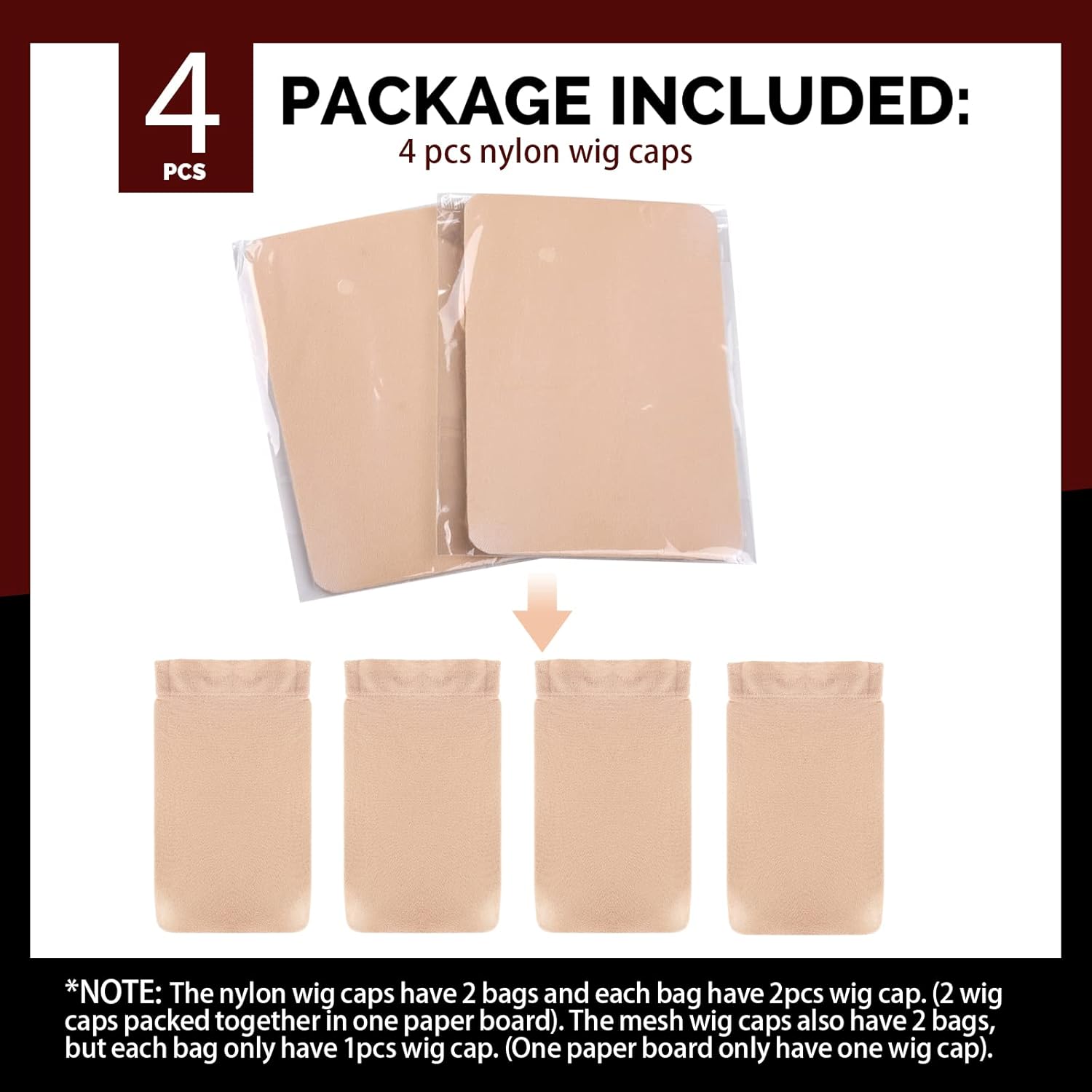 - Package Included: 4PCS nylon wig caps Nude. Note: The nylon wig caps have 2 bags and each bag have 2pcs wig cap. (2 wig caps packed together in one paper board). Total 2bags and 4pcs.