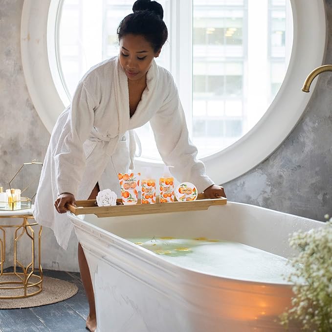 - COMPLETE HOME SPA EXPERIENCE: This stunning 8 pieces bath gift set includes 5 amazing Citrus scented bathing essentials and Bath Bomb, Towel, Mirror. The bath essentials are a shower gel, a bubble bath, a body butter and a body lotion. It rejuvenate the skin while transforming any bath into a soothing retreat. Perfect for self-care lovers, this spa set offers a calming and indulgent experience, leaving skin refreshed and pampered.