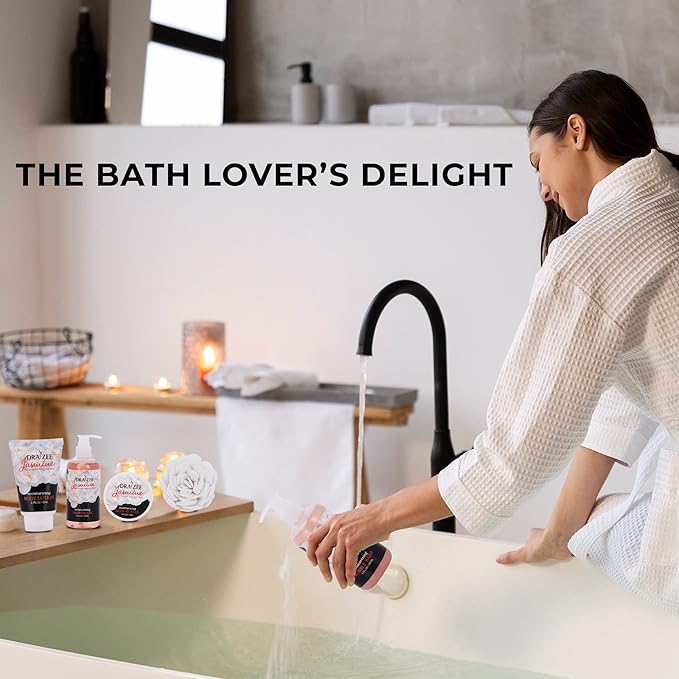 - COMPLETE HOME SPA EXPERIENCE: This stunning 8 pieces bath gift set includes 5 amazing Luxury Jasmine scented bathing essentials and Bath Bomb, Towel, Mirror. The bath essentials are a shower gel, a bubble bath, a body butter and a body lotion. It rejuvenate the skin while transforming any bath into a soothing retreat. Perfect for self-care lovers, this spa set offers a calming and indulgent experience, leaving skin refreshed and pampered.