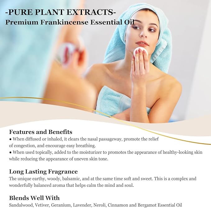 - QUANLITY ASSURANCE - Frankincense essential oil is extracted from frankincense resin, exudes a warm and pure woody aroma, and reveals a touch of fruity aroma.