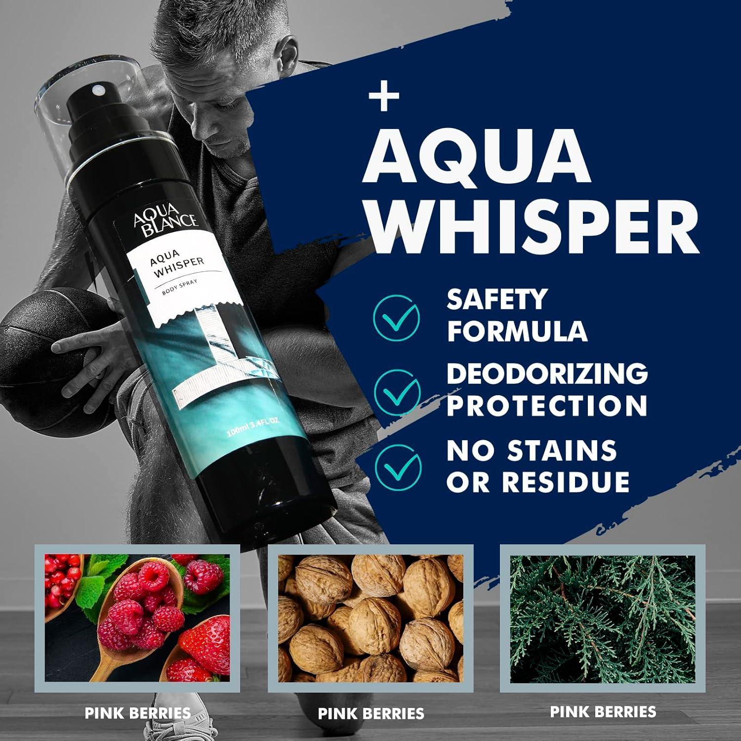 - Aqua Whisper boasts a captivating blend of top notes of pink berries, middle notes of walnut leaf, and base notes of cedar, sandalwood, and myrrh. The result is a fragrance that is both invigorating and comforting, perfect for any occasion.