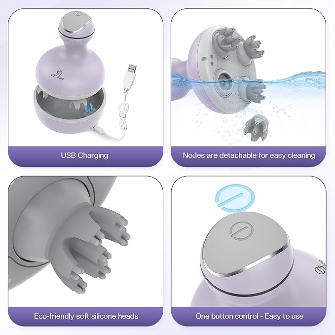 - Waterproof and Skin-friendly:Comfier electric head massager is made from IPX-7 waterproof material, allowing you to use it while taking a shower for a proper scalp massage. The friendly soft silicone heads prevent hair from being pulled or tangled, ensuring a gentle and skin-friendly experience. Additionally, the massage nodes are detachable, making cleaning a breeze and prioritize your comfort and safety.