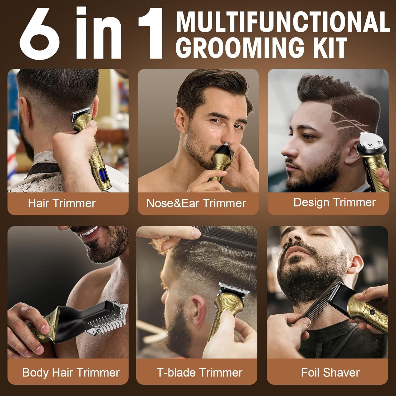 - 6 IN 1 MULTI-FUNCTIONAL GROOMING KIT - Precision shaving system design, 6 trimmer heads for all your grooming needs and perfect for all hair styles: hair Clipper, precision trimmer, nose hair trimmer, beard trimmer, foil shaver and body hair clippers. The men's grooming kit is equipped with 8 attachment combs (1.5mm/3mm/ 6mm/ 9mm) and 1 comb, 1 oil, 1 cape, 1 clean brush. This kit has everything you need for trimming and clipping to achieve professional results at home