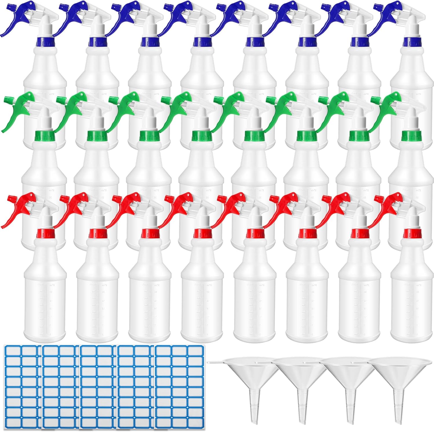 Zubebe 24 Pack 32 oz Plastic Spray Bottle Bulk Empty Leakproof Heavy Duty Spray Bottles for Cleaning Supplies Mist Bottles with Label and Adjustable Nozzle for Plant(Blue, Red, Green,Clear Scale)