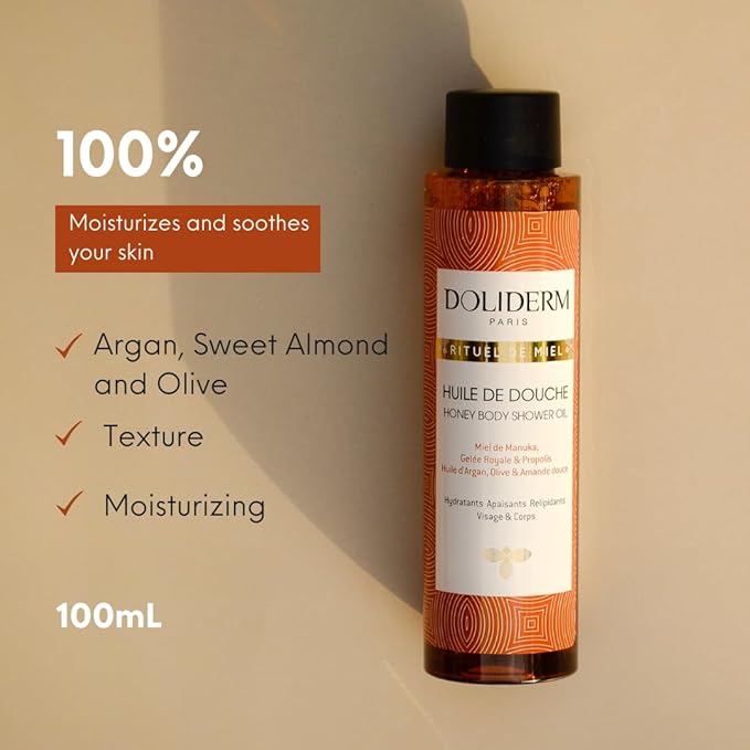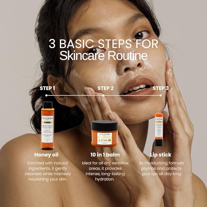 - Complete Honey Skincare Ritual – The Doliderm Honey Ritual Kit includes three essential products: a nourishing Shower Oil, a versatile 10-in-1 Balm, and a hydrating Lip Care Stick. Each is enriched with honey, royal jelly, and propolis to deliver an indulgent skincare experience.
