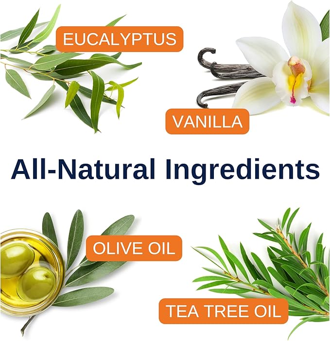 - ALL NATURAL - A unique mixture of only 4 natural ingredients: Tea Tree Oil, Blue Mallee Eucalyptus, Vanilla, and Olive Oil.