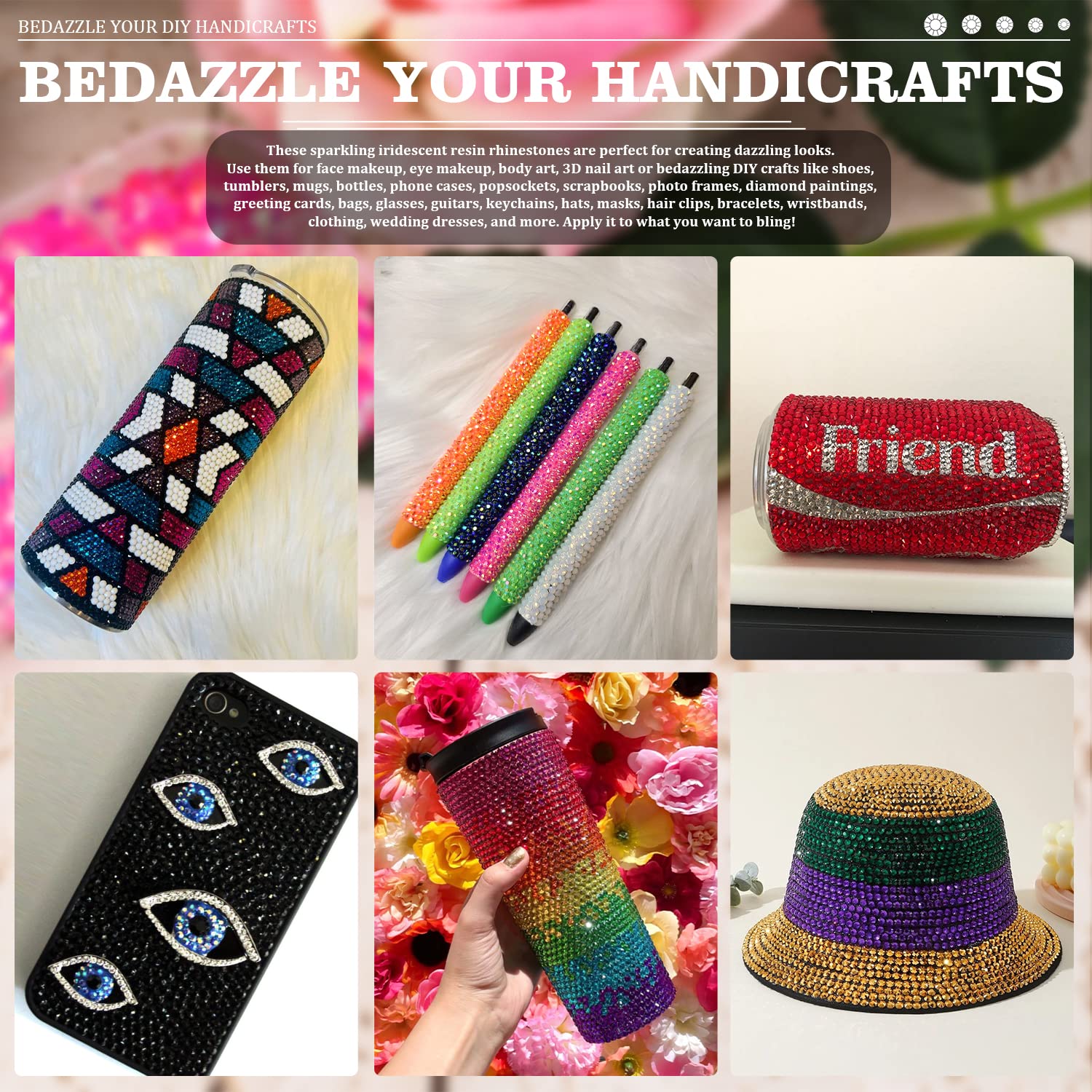- ๐WIDE APPLICATION -- These sparkling iridescent resin rhinestones are perfect for creating dazzling looks. Use them for face makeup, eye makeup, body art, 3D nail art or bedazzling DIY crafts like shoes, tumblers, mugs, bottles, phone cases, popsockets, scrapbooks, photo frames, diamond paintings, greeting cards, bags, glasses, guitars, keychains, hats, masks, hair clips, bracelets, wristbands, clothing, wedding dresses, and more. Apply it to what you want to bling!