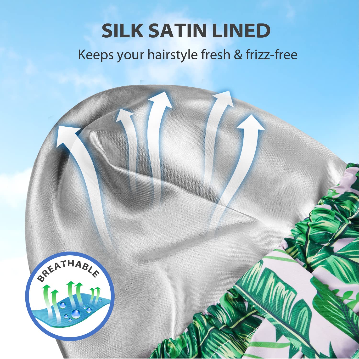 - Breathable & Reusable Hair Cap: The outer layer of INNELO shower cap is a waterproof fabric and the inner lining is a soft and smooth satin, which gently glides over the hair to protect your hair from the dryness caused by friction, reduce hair frizz, tangles and thinning. Suitable for women with curly, frizzy, braids, wigs, dreadlocks day or night, also for long thick hair girls.
