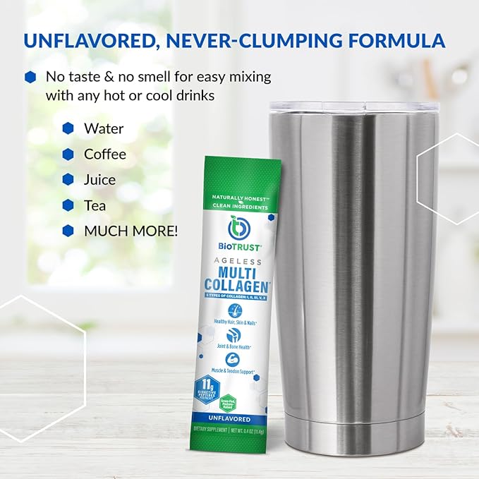BioTrust Ageless Multi Collagen Peptides Powder – Types I, II, III, V, X – Unflavored Collagen Powder for Women & Men – Hydrolyzed Protein– Grass Fed Beef, Fish, Chicken, Eggshell Membrane(16 packets)