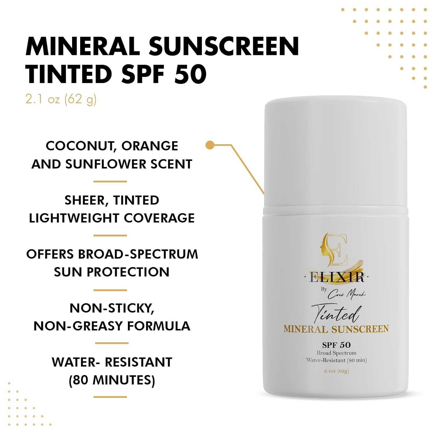 Elixir by Coco March Broad Spectrum Mineral Tinted Sunscreen SPF 50 Water-Resistant-80 min, Hydrates and Enhances Skin, Adults and Children- 2.1 oz 59 g