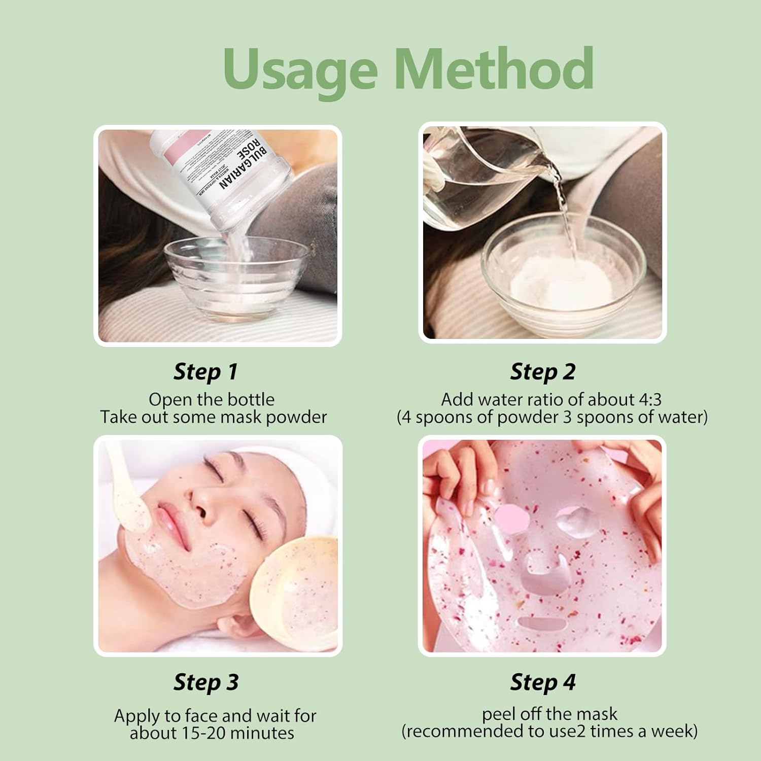 - Mixing ratio: Mask powder and water are mixed in a ratio of 4:3. If you feel that it is too thin and it will slide down your face, you can add more powder. If you feel that it is too dry to fully absorb, you can add some water. If you With some patience, you will save yourself the cost of going to the beauty salon