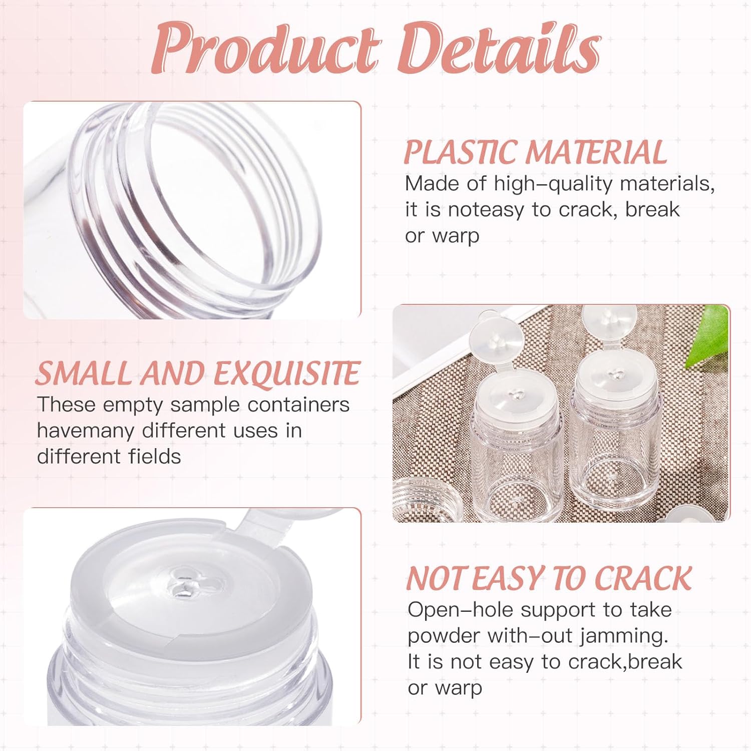 - The powder jar is made of the durable plastic with good quality; The lined screw cap can keep powder from spreading out.