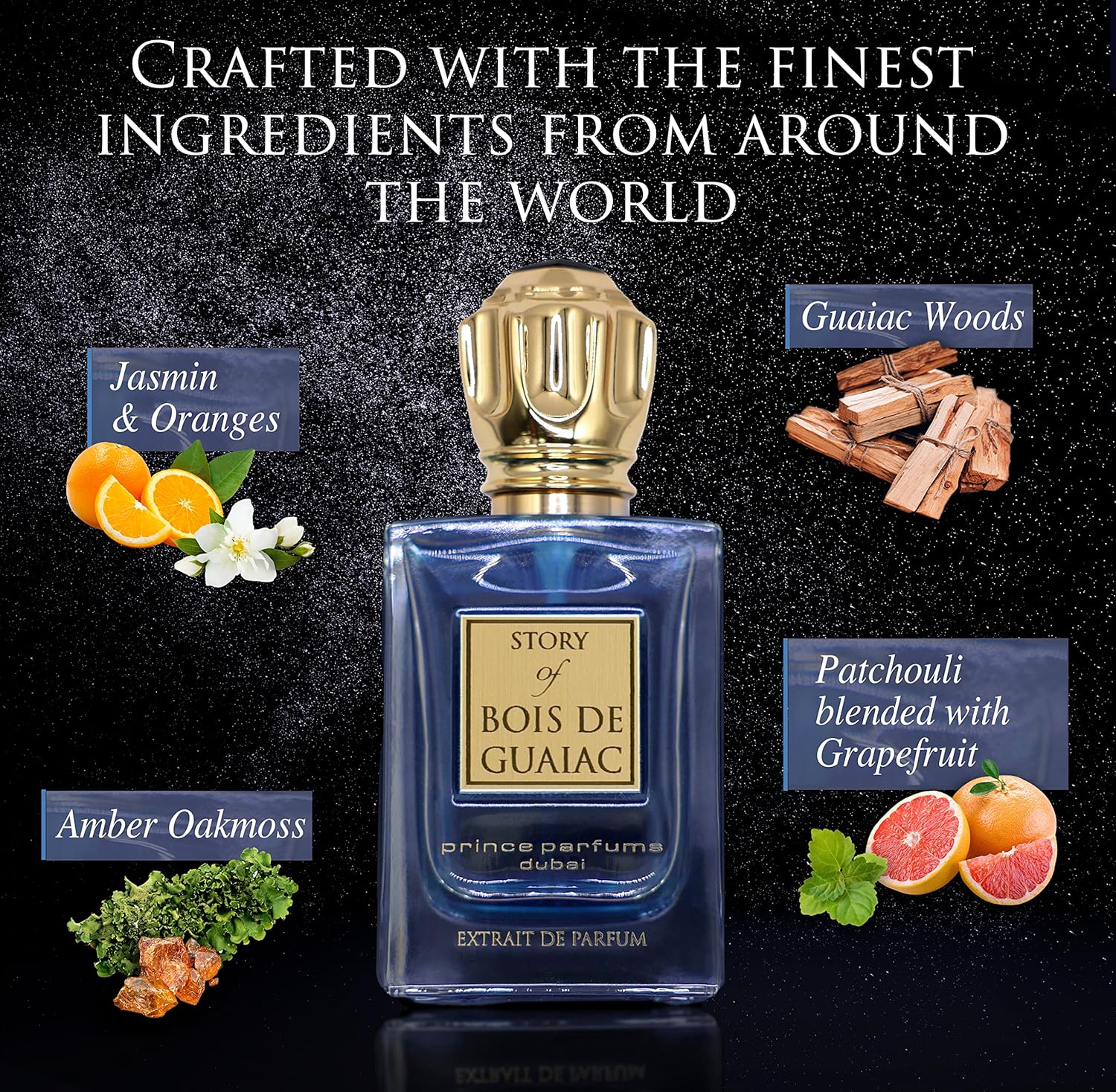 Prince Parfums Dubai - Story of Bois De Guaiac For Men - 3.4 Ounces - Extrait de Parfum - Exquisite Luxury Fragrance Exotic Woods, Amber, Citrus Notes - Refined Sophisticated Scent
