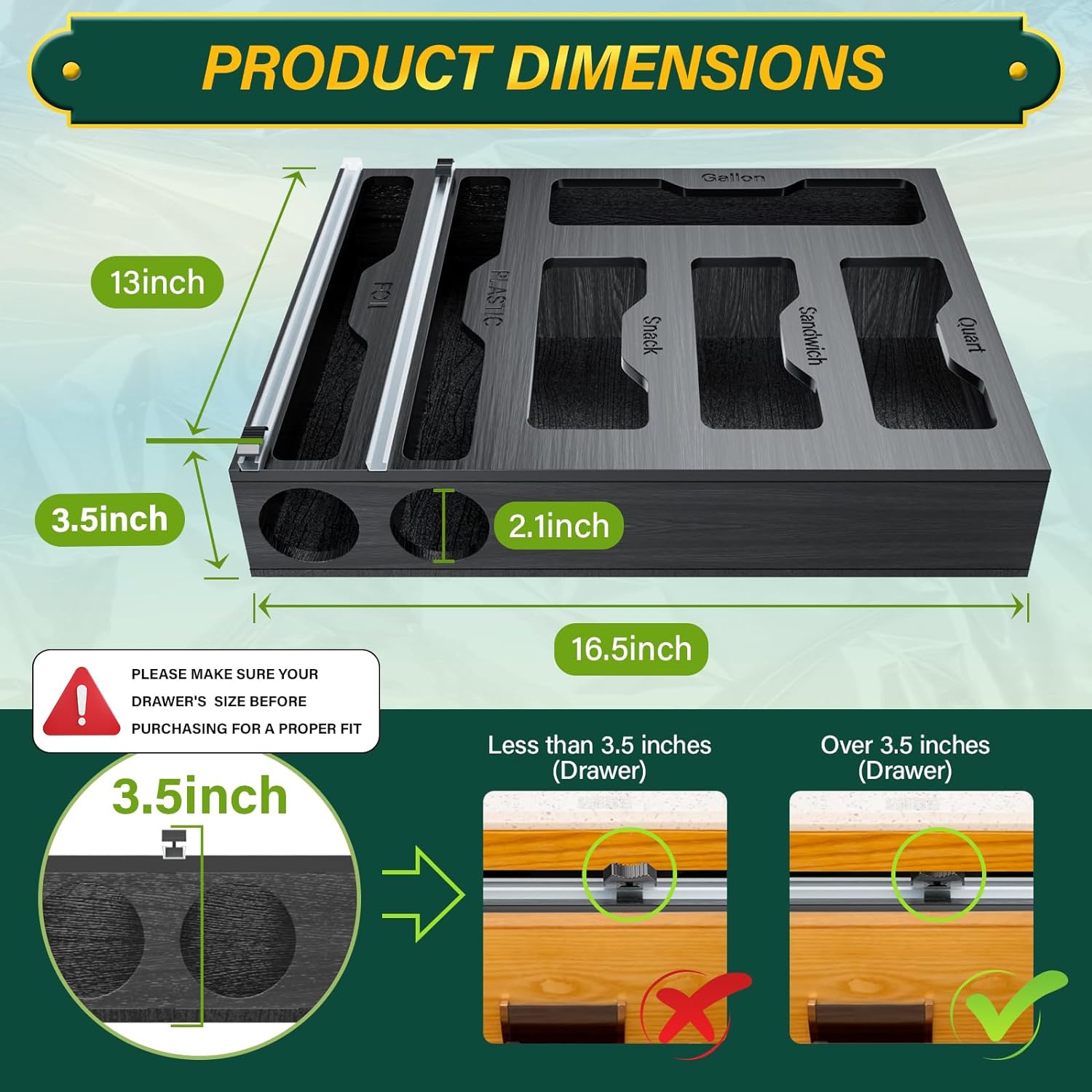 - 【Easy Identification】The bag organizer is equipped with stylish engraved wrap names in every slot dispenser to help you effortlessly identify the contents. Our aluminum foil dispenser comes fully assembled, 1 piece box with 2 slots & 4 storage bag organizers, offering you different ways of organizing plastic wraps. ( Please measure the size of your wraps rolls and kitchen before ordering to make sure that our foil organizer with sliding cutter will fit.)