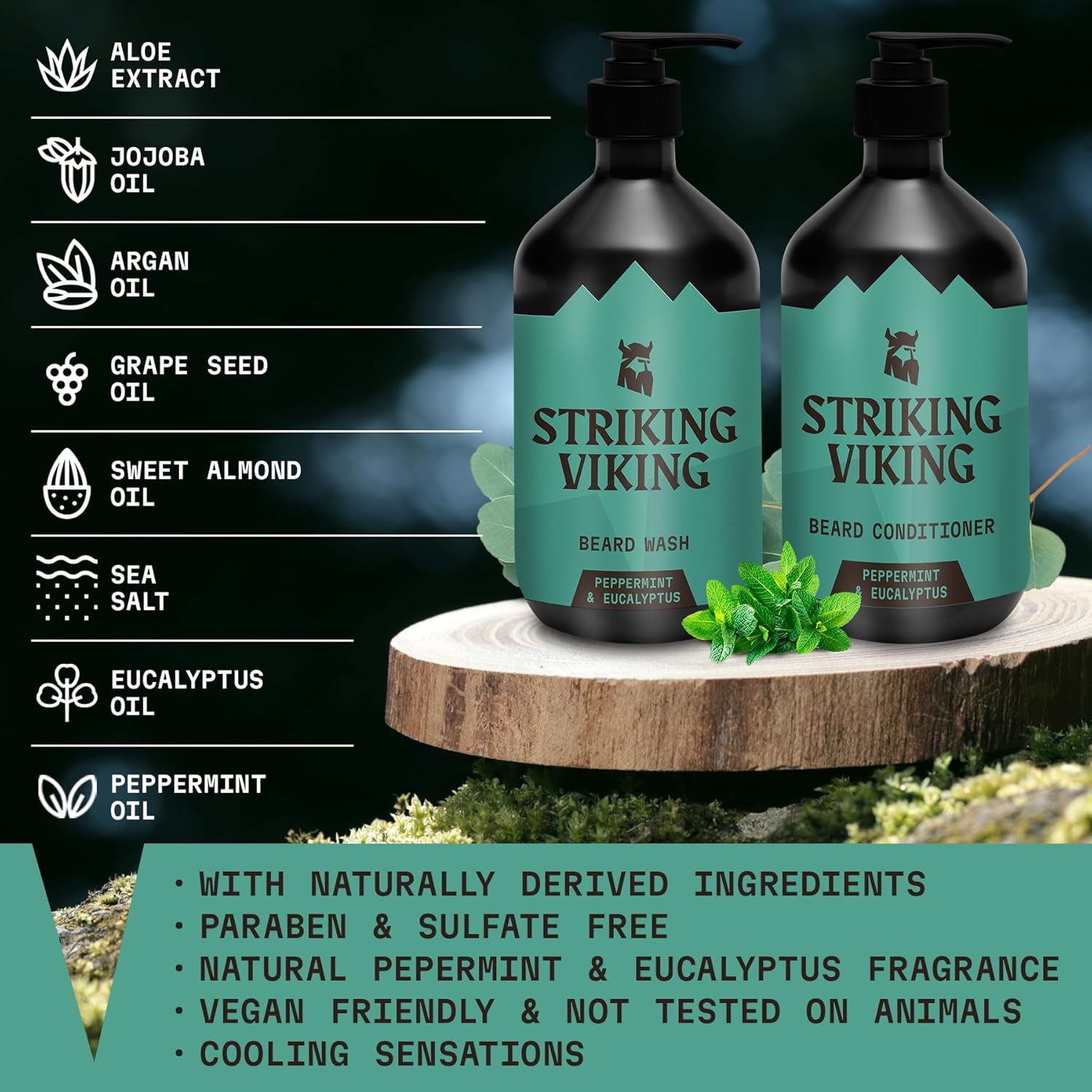 Striking Viking Beard Wash and Conditioner - 10 Fl Oz per Bottle, Peppermint & Eucalyptus - Paraben & Sulfate Free, with Jojoba Oil - Deep Clean Beard Shampoo & Conditioner - All Facial Hair Types