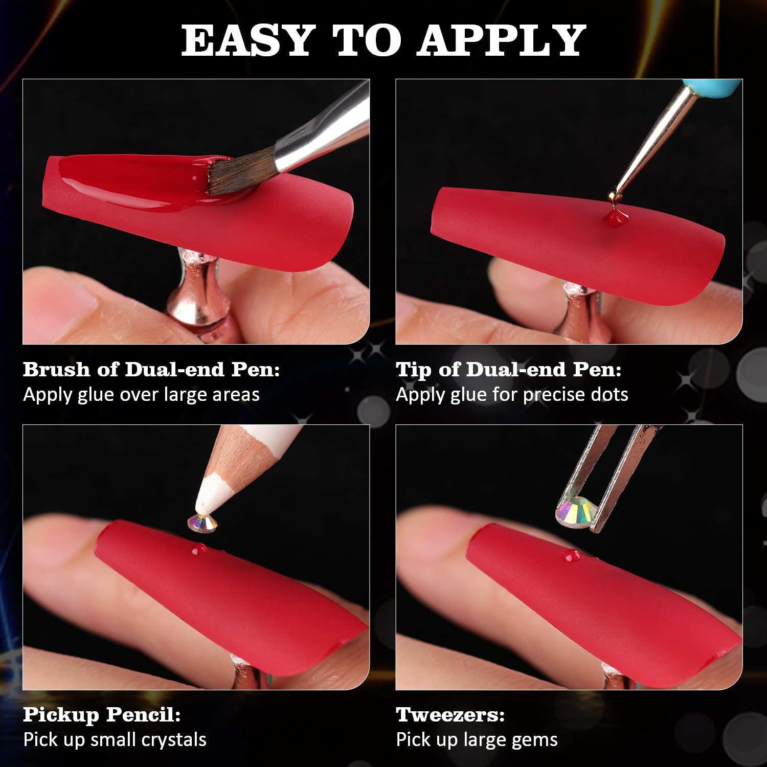 - ๐MULTIFUNCTIONAL TOOLS -- The wide-head brush end of the dual-end dotting tool makes it easy to apply a large amount of your nail polish to the nail surface at once, while the other mini dotting end is great for detailed drawing. Picker pen can help you handily pick up small nail stones, while tweezer is a better choice for big beads. The flatback gems are not self-adhesive and glue-needed. (glue is not included.)