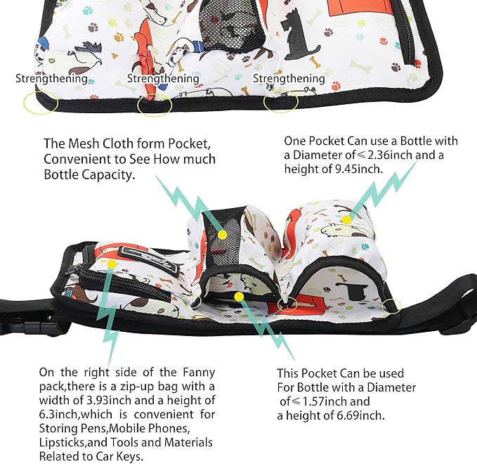 - 2、 Waist pack size: length 11.4 inch width 7.67 inch. 3、 design: A: The design of the bag has A total of 4 separate pockets, the front has two large pockets and A small hidden pocket can be temporarily used for different capacity bottle, two large pockets available diameter ≤2.36inch, 9.45inch high bottle, one of the mesh cloth form pocket, convenient to see how much bottle capacity; Another small hidden pocket can be used for the diameter ≤1.57, 6.69inch high bottle;