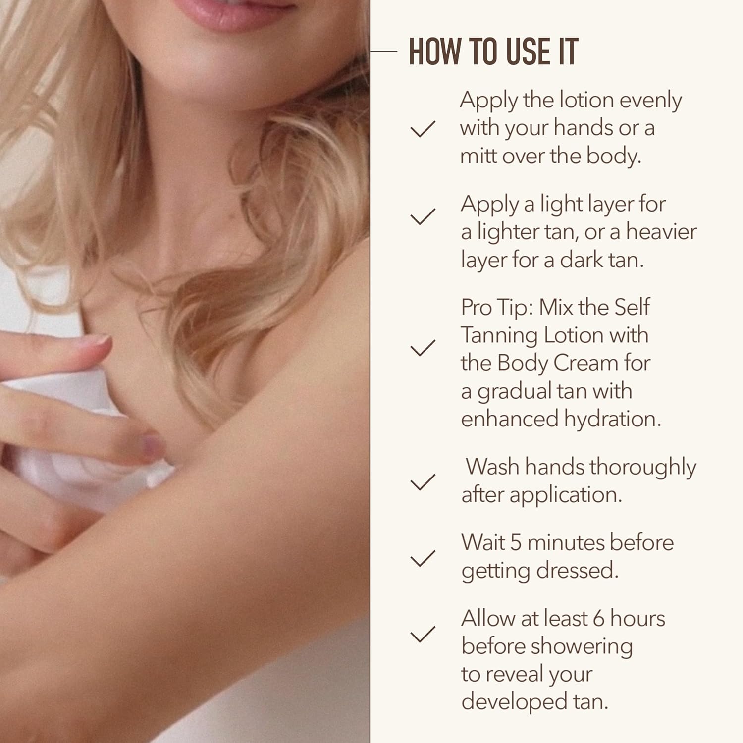 - EASY-TO-USE, BUILDABLE TAN: Apply evenly with your hands or a mitt for a streak-free finish. For a subtle glow, use a light layer; for a deeper result, apply additional layers. Wait 5 minutes before dressing and allow at least 6 hours before showering. Maintain your tan by moisturizing daily and reapplying weekly.
