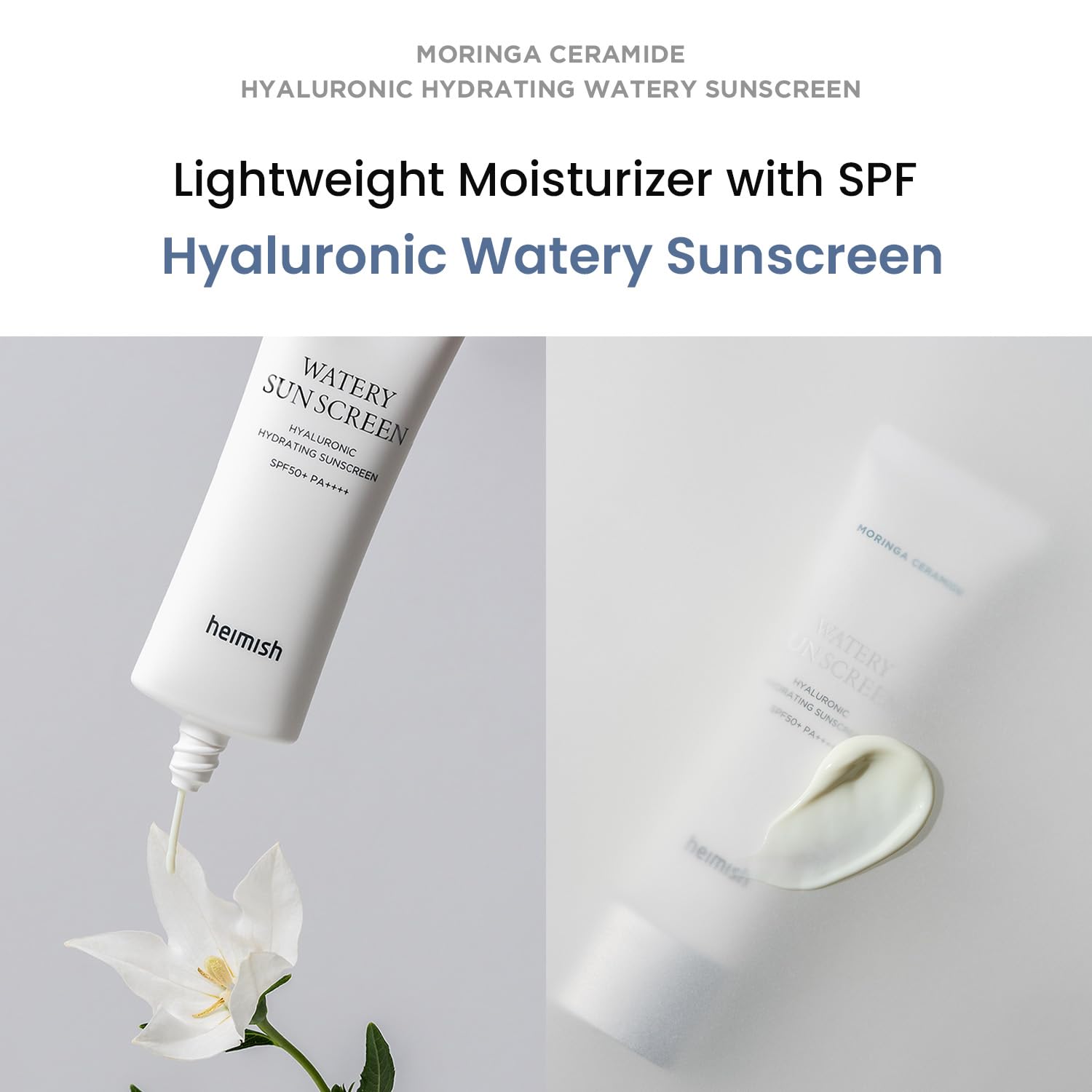 HEIMISH Moringa Ceramide Hyaluronic Hydrating Watery Sunscreen - SPF Face Moisturiser, Daily Sunscreen For Face, Broad Spectrum SPF 50, Non-greasy, Lightweight with Hyaluronic Acid, 1.7fl.oz/50ml