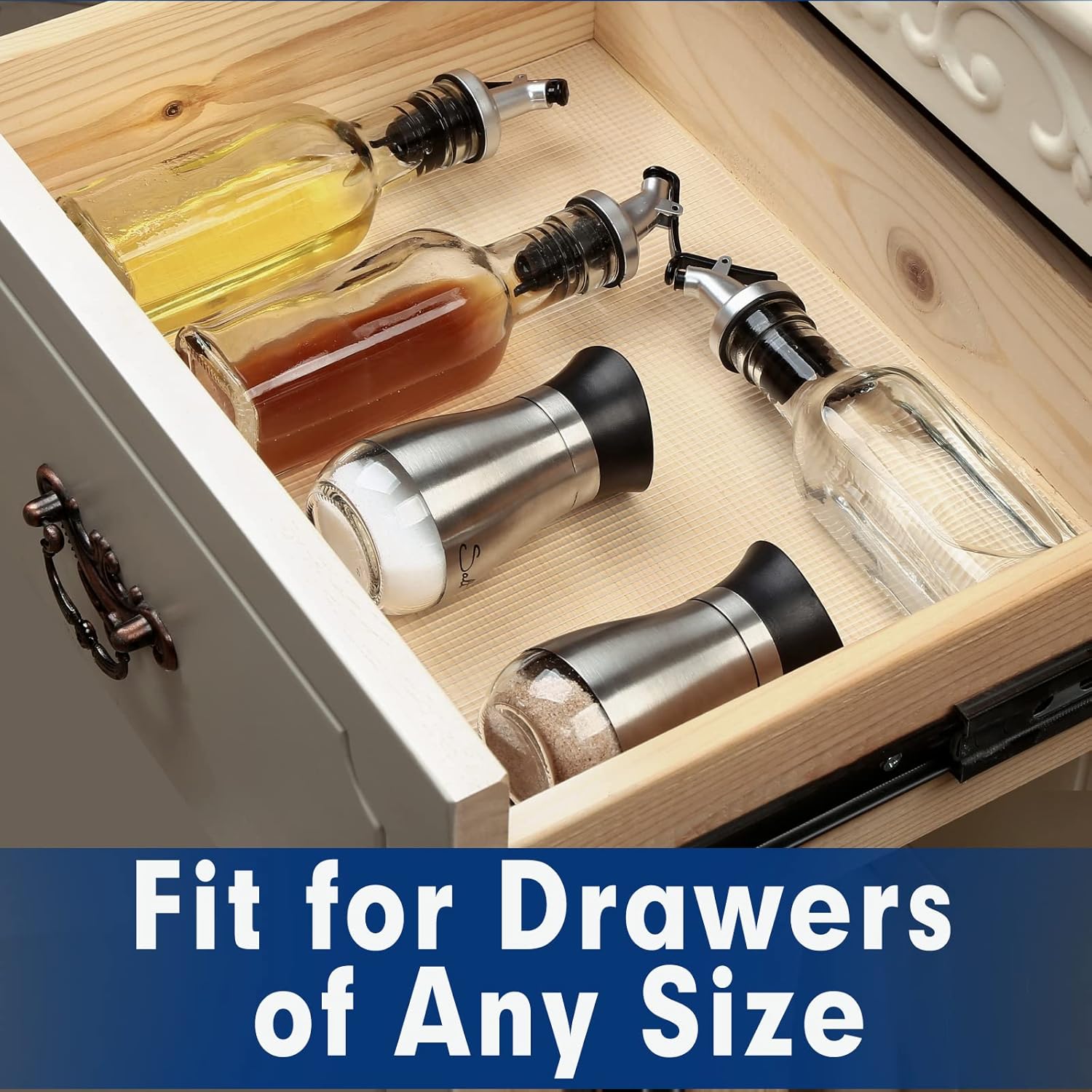 - [Grip Non-Slip Design] Our shelf liners feature a strong, textured grip that effectively prevents slipping and bunching in drawers, cabinet shelves, and wire shelving, ensuring everything stays organized and in place.