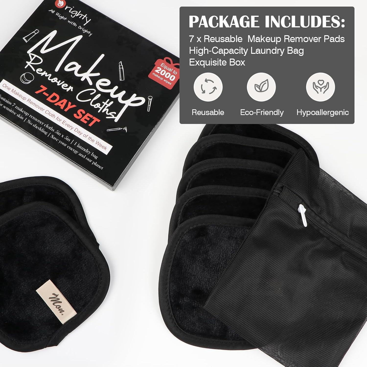 Orighty Makeup Remover Cloths 7-Day Set, Premium & Reusable Makeup Remover Pads, Erase Make-up With Just Water, Make-up Set For Eyes, Lips, Foundation and more, Ideal Choice For Women (Black)