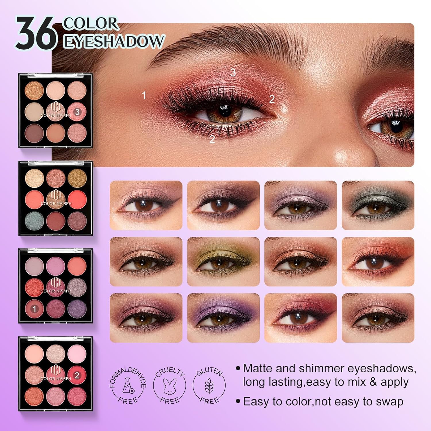 - All-in-one Makeup Kit: The women makeup kit included 36 colors matte & pearl eyeshadow powder, 4 colors lip oil, 4 colors eyebrow powder, 4 colors blush palettes, 2 color highlighter, 2 color contouring powder, 4 pcs lip gloss, 1 pcs lip balm, 1 pcs lipliner pencil, 1 pcs eyeliner pencil, 4 pcs makeup brushes, fulfilling your makeup needs to create a flawless look.