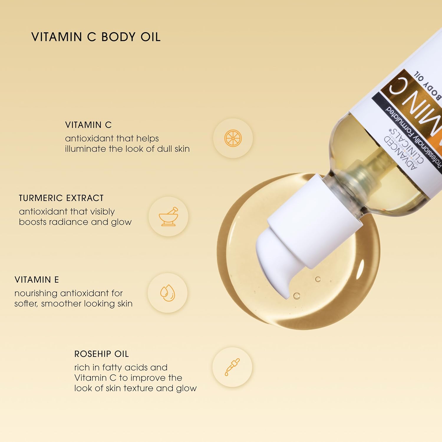 Advanced Clinicals Vitamin C Brightening Body Oil For Women & Men | Vitamin C Oil Skin Care Body Moisturizer With Vitamin E + Botanicals To Help Improve Appearance Of Dark Spots + Dry Skin, 2PC