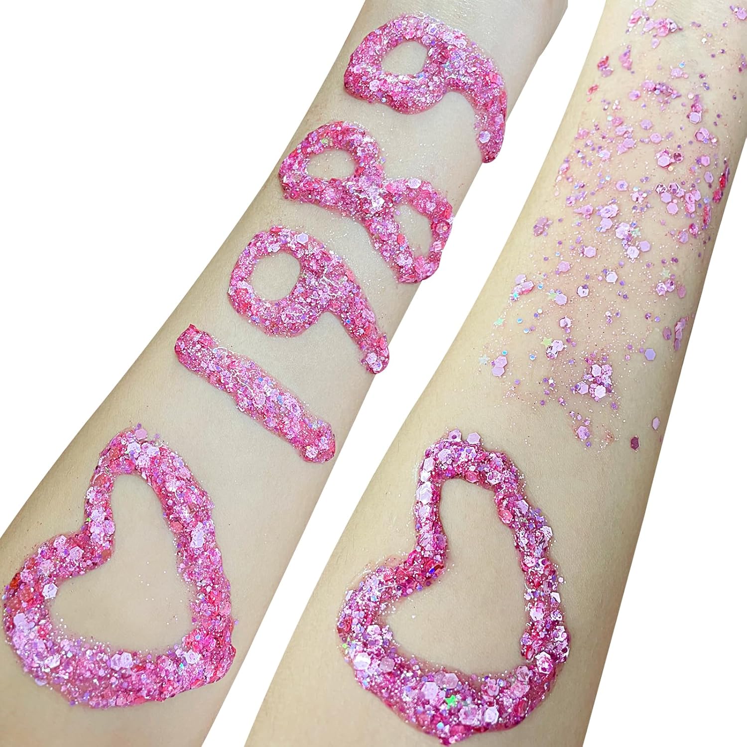 - Multiple Uses---The pink accessories face glitter gel can be used on face, body, cheeks, hair,and other more parts of body,suitable for Music Festival Rave Accessories,Sexy Singer Concerts,celebrations like the school color party,the wedding,Halloween,Christmas,bar,party and other more performance occasion, pink out accessories for spirit week,make you be the most attractive woman in the crowd. When using the glitter gel on the body, you can dust some on the collarbones and shoulders for a super shimmering effect