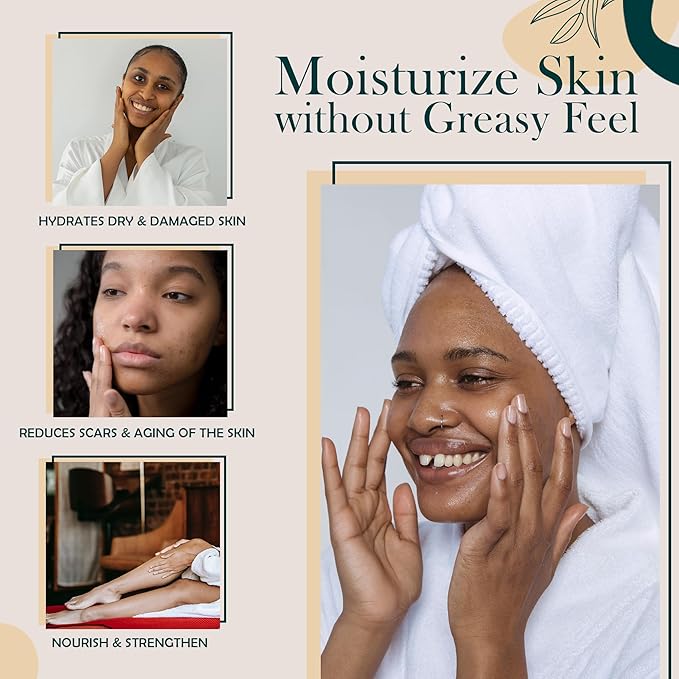 - DEEPLY HYDRATE AND MOISTURIZE: Quench your skin’s thirst with our hydrating body oil enriched with vitamin E oil, coconut oil, jojoba oil, olive oil, and almond oil. Designed to deeply nourish, this moisturizing body oil penetrates dry layers, reviving damaged skin while restoring its soft, supple glow. Perfect as a body oil after shower, it renews your skin without any greasy residue. Embrace the natural luxury of smooth, vibrant skin with our pure moisturizing oil for body.