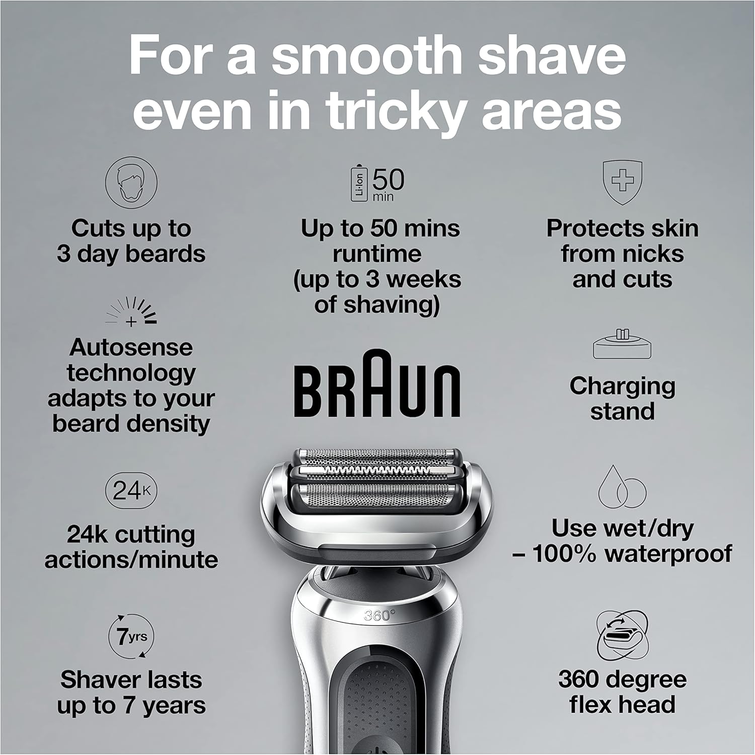- MORE EFFICIENT: 360 Flex adaptive system allows for a smooth shave even in tricky areas, paired with Braun's AutoSense Technology that adapts power automatically depending on your beards density