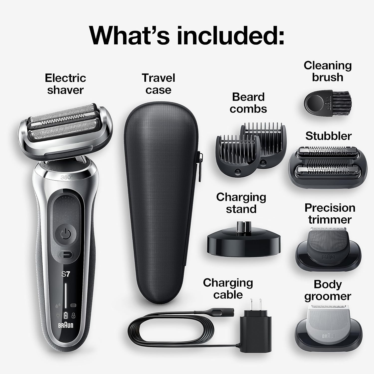 - WHATS IN THE BOX: Series 7 electric razor; 5 additional trimmer attachments, travel case, charging stand, cleaning brush, charging cord, and user manual