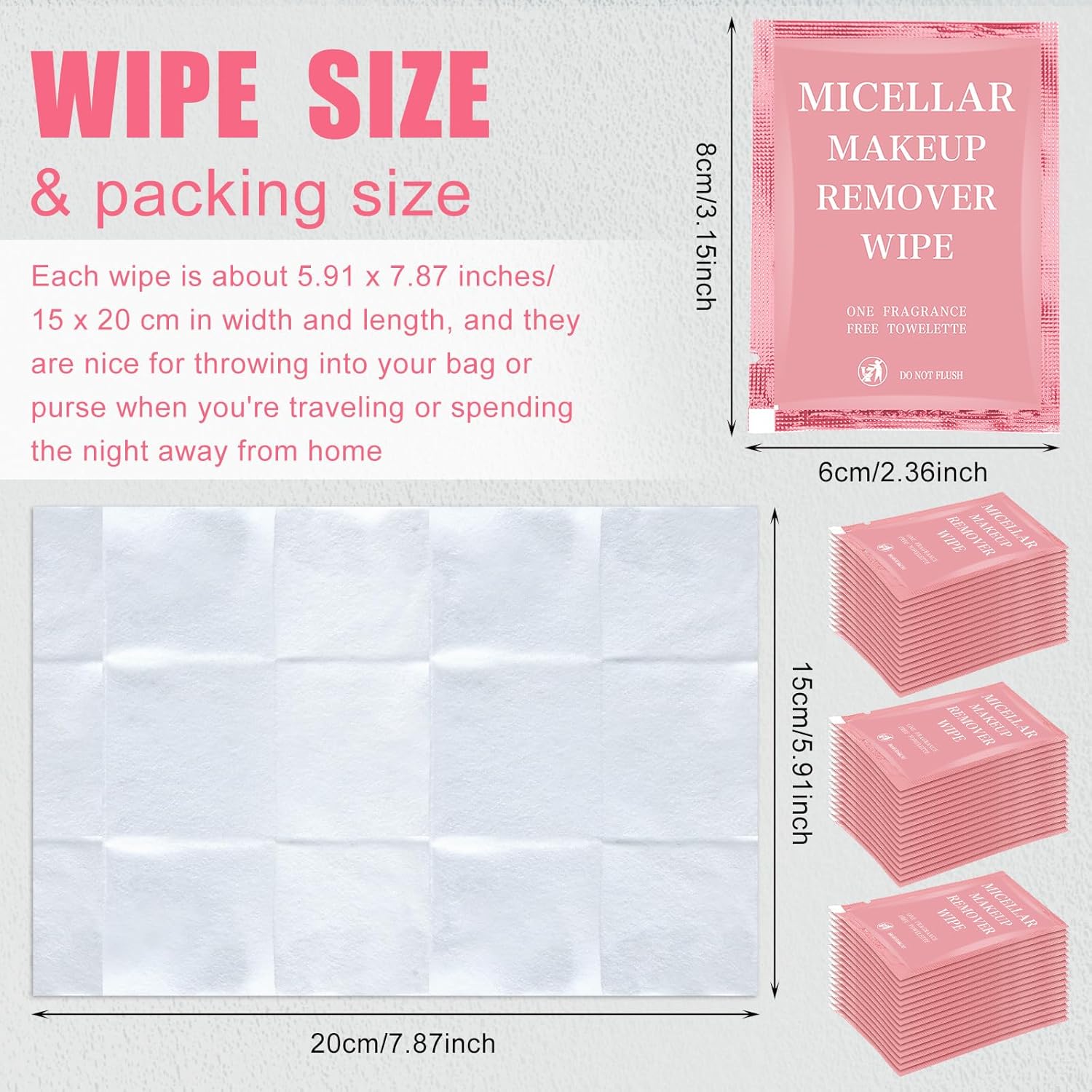 - Convenient Size: our individual makeup remover wipes are designed to be the suitable size for your makeup removing needs; Each wipe is about 5.91 x 7.87 inches/ 15 x 20 cm in width and length, and they are nice for throwing into your bag or purse when you're traveling or spending the night away from home