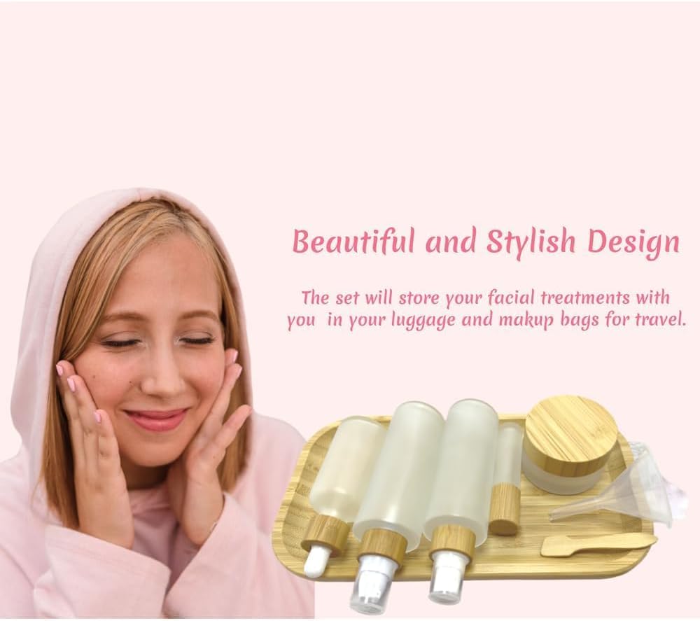 - 【Multifunctional and Versatile Travel Size Bottles】Our refilable bamboo glass containers are perfectly use for packing cosmetics,skin care & makeup products such as face mask,makeup remover,face scrubber,moisturizer,beauty,oil cleanser,facial moisturizer,toner for face,skin care set,cleansing balm,face cleanser,face serum,face exfoliator for your trip at anytime and anywhere you may need.It is ideal for travel packaging and home DIY personal care.