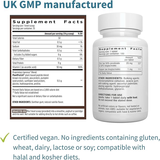 Vegan Vanilla Collagen Protein Powder + Zinc Complex Vegan Bundle for Skin, Hair & Nails. Complete Collagen Boosting Formula + 25mg Chelated Zinc, by Igennus
