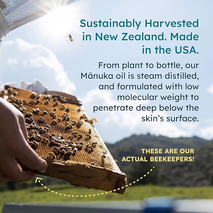 - Nature’s nectar: leaves derived from the manuka plant are steam-distilled to create manuka oil, nature’s skin care powerhouse; it fights blackheads, reduces oiliness, soothes irritation, & combats acne while outperforming tree oil by 15X