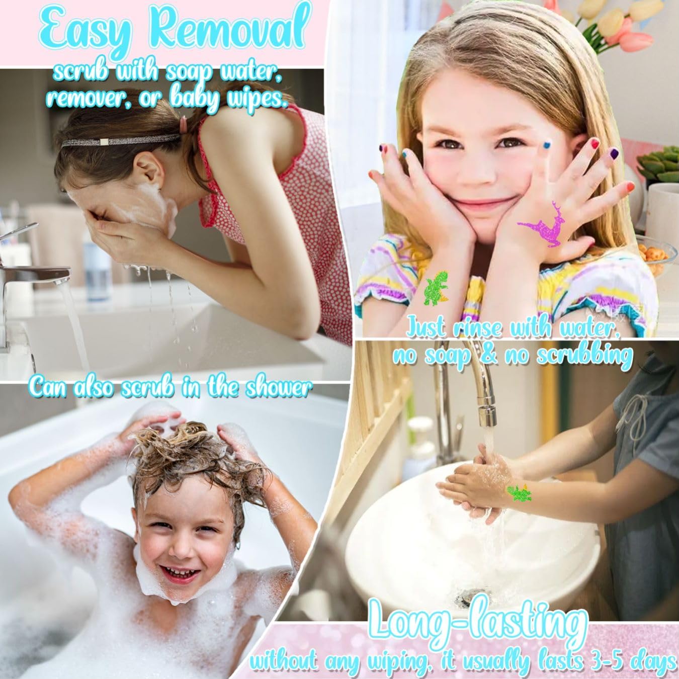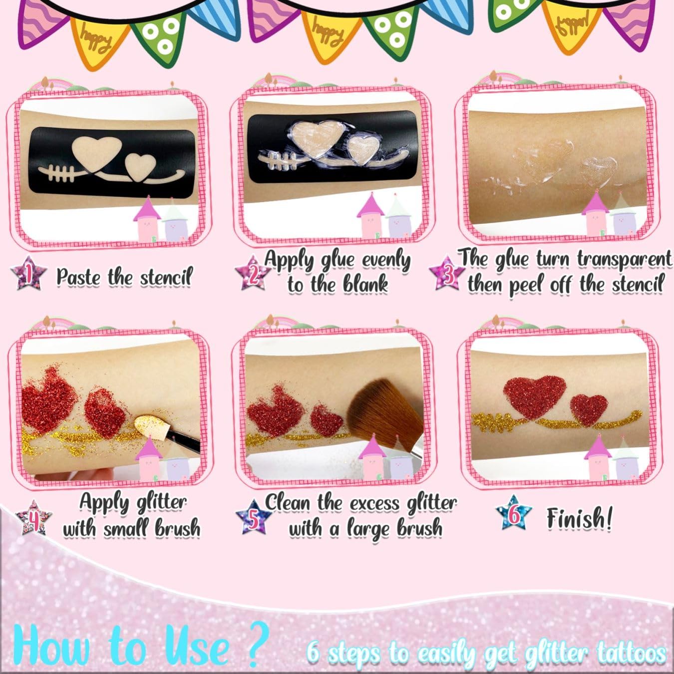 - All in One Set: Rich temporary tattoo accessories will meet your needs for glitter makeup. Each set comes with 50 jars of glitter in different colors, 199pcs tattoo stencils, 2 sheets of gemstone stickers, 4 bottles of glue, and 5 brushes. With this complete glitter tattoo kit, get the tattoos your child wants in no time and design tattoos that save money for everyone.