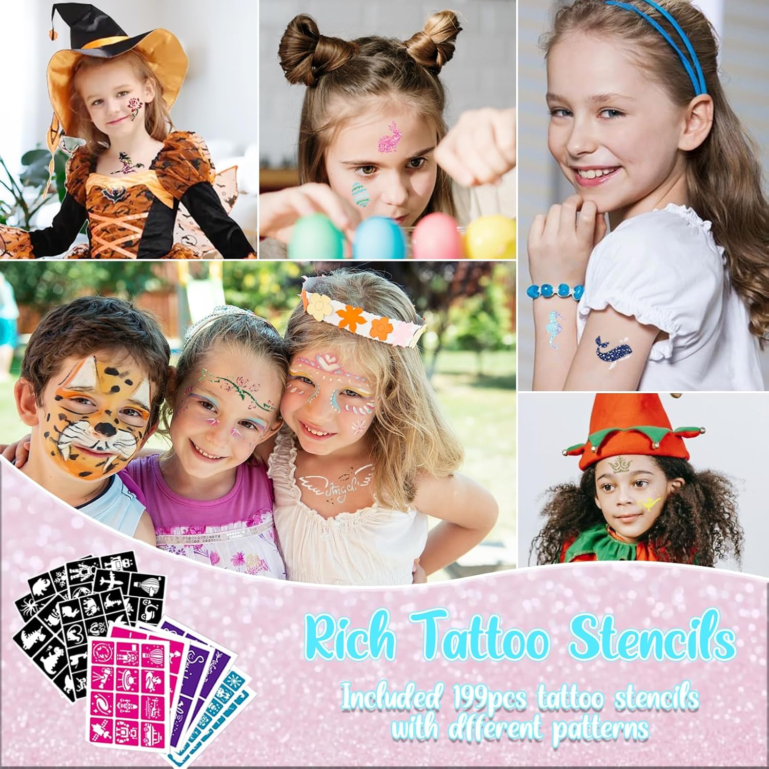 TEUVO Glitter Tattoo Kit for Kids, 50 Glitter Colors, 199 Stencils, 2 Gem Stickers, 4 Glue, 5 Brushes Body Face Arts Glitter Makeup Temporary Tattoos for Girls Halloween Christmas Birthday Party Gifts