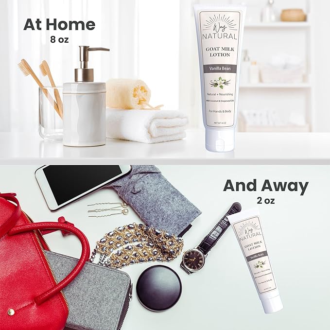 Goat Milk Lotion, Vanilla Bean - Home & Away Set, Natural, Body/Hand - Goat Milk Hand Cream for Women and Men - Dry Skin Relief - Vanilla Lotion - 8oz & 2oz Travel Size Tube