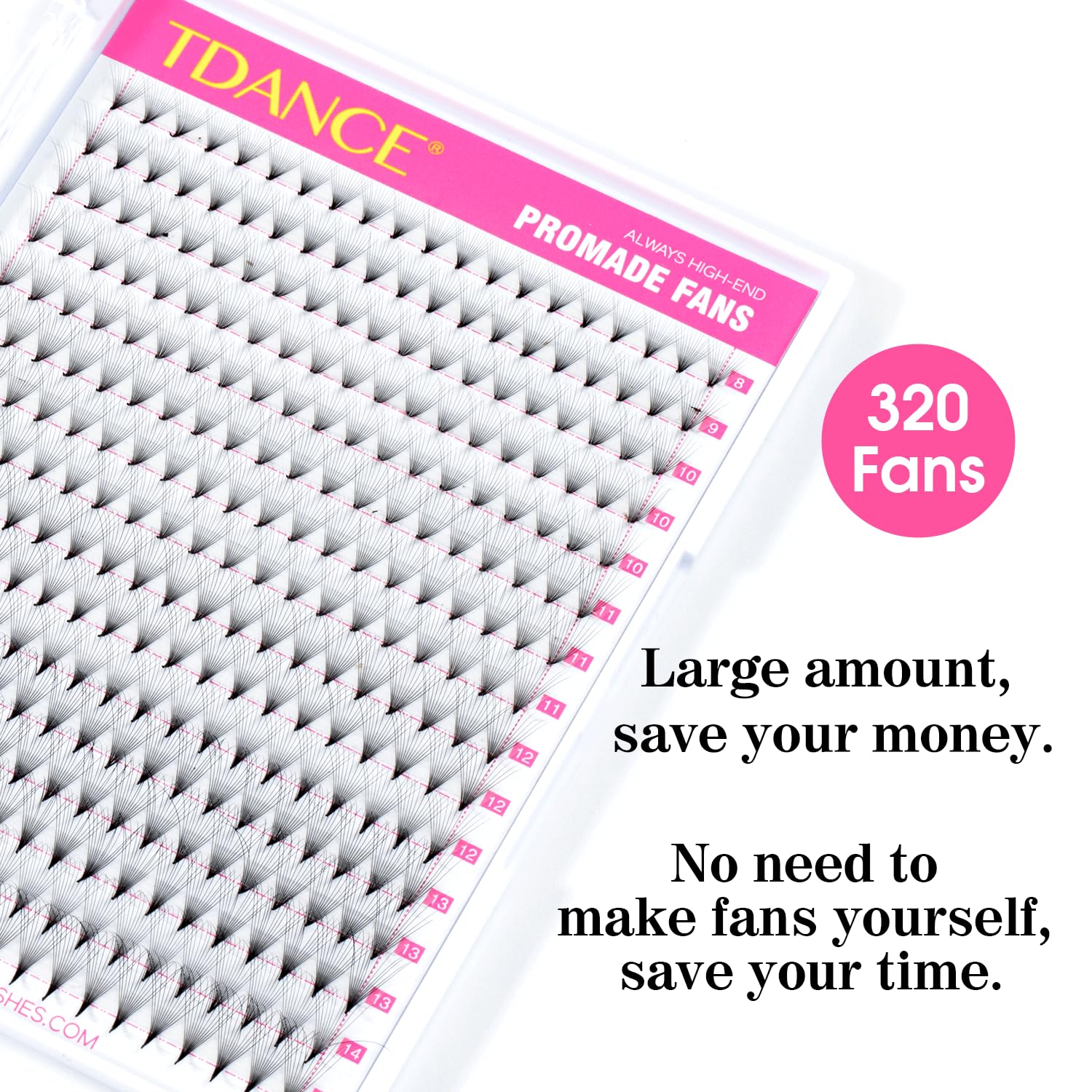 - New middle stem premade fans: TDANCE premade volume eyelash extensions - 320 fans. There are 16 rows in one tray, with 20 fans in each row. Save time, no need to spend hours making fans for your customers, we have done it for you! All you need to do is just take the premade fans out of the tray and apply them on the customer's eyelashes. Leave time for more customers to increase your income!