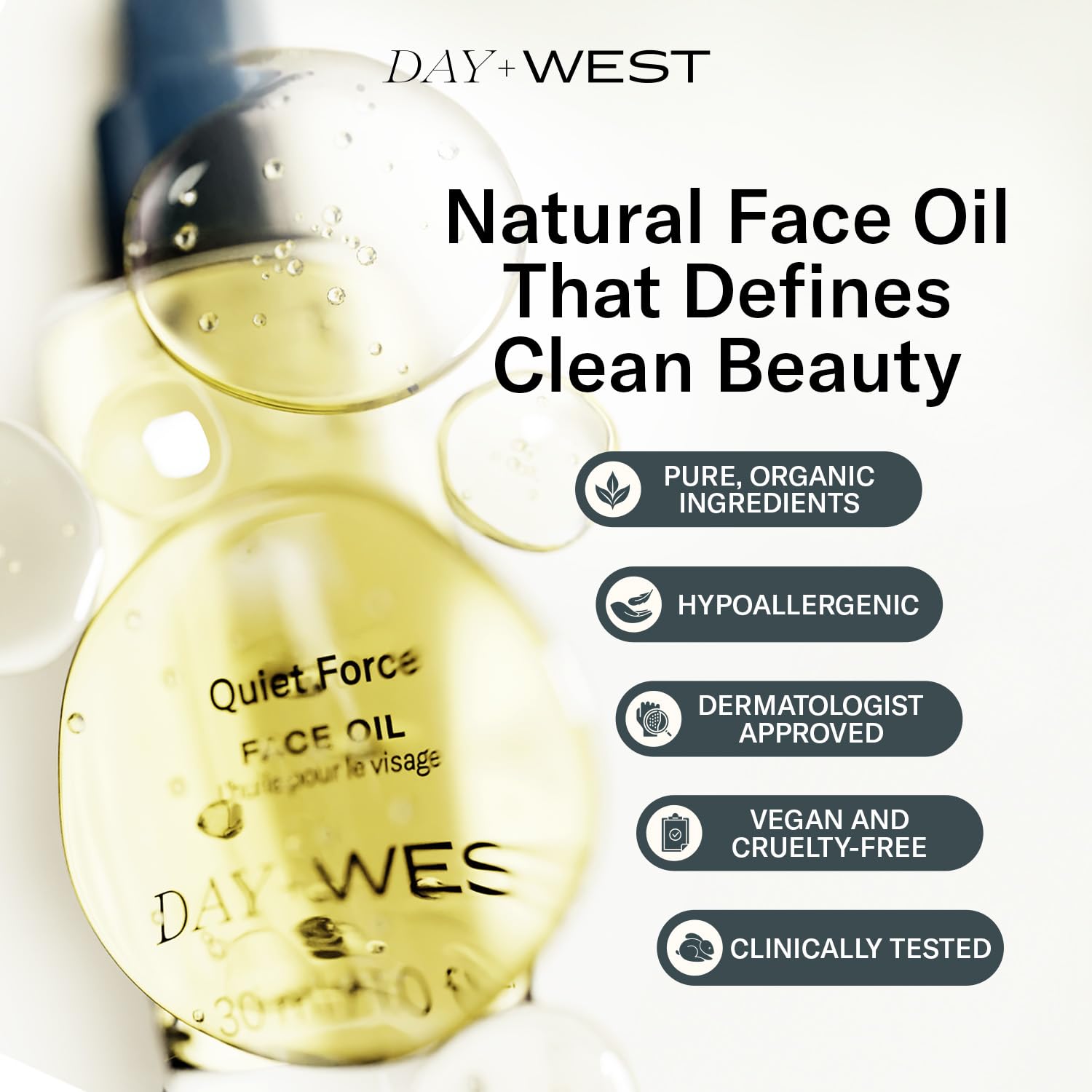 - BOOSTS RADIANCE AND EVENS SKIN TONE: Brightening extracts from strawberries and blueberries work together in this hydrating face oil to deliver a natural glow. It combats dullness while evening skin tone, leaving your complexion radiant and refreshed. Ideal for anyone seeking a hydrating face oil or a face oil for dry skin that also boosts radiance, Day+West Quiet Force Face Oil organic offers a clean, plant-based solution for vibrant skin.