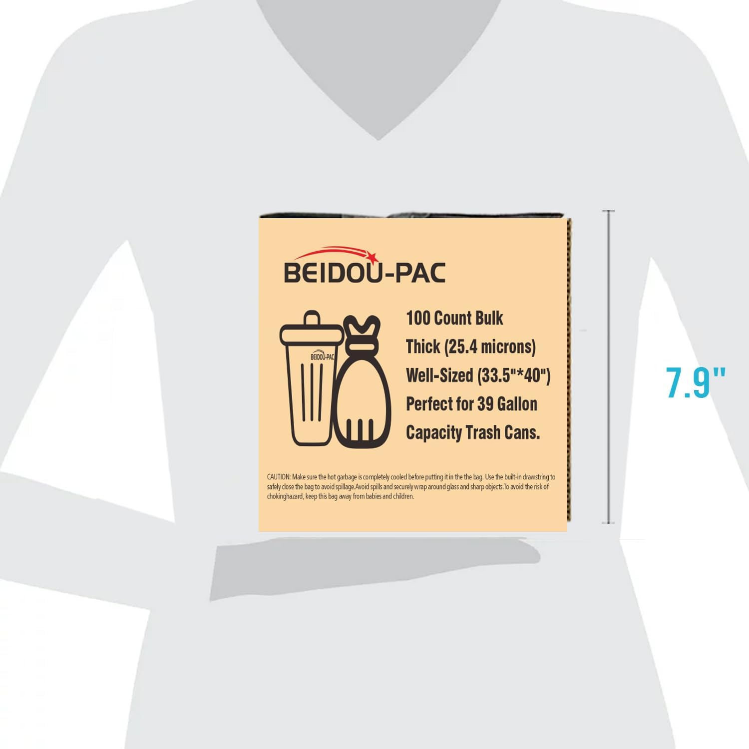 - 1, Product information: BEIDOU-PAC 39 gallon black drawstring plastic can liners, Size: 33.5"*40"x 25.4 mic, Total 100 bags bulk (25 PCS/ROLL , 4 CORELESS ROLLS/CTN), Perfect for 39 Gal Capacity Office, Bedroom and Kitchen Wastebasket trash bins.