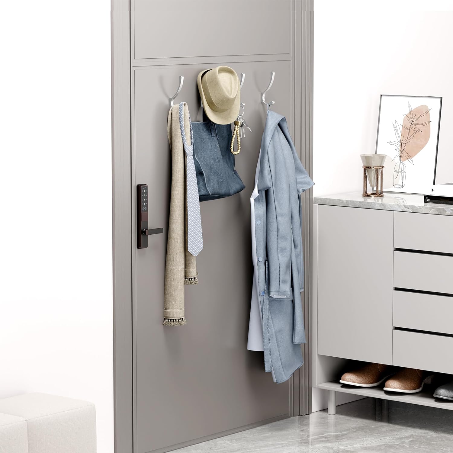 Coat Hooks Wall Mount Silver - Heavy Duty Wall Hooks for Hanging Backpacks, Towels, Bags, Hats, Clothes – Holds Up to 30 lbs - Large Metal Hooks for Closet, Bathroom, Mudroom, Door - 4 Pack